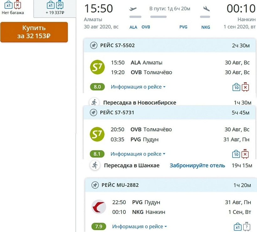 Авиасообщение между казахстанским Алматы и китайским Нанкином не могу отнести к очень развитым, потому что прямые полеты между городами не осуществляются, а транзитные авиарейсы с одной пересадкой предлагают только две компании: