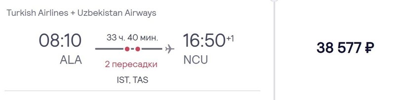 Более дешевый и быстрый вариант — перелет с Turkish Airlines, Uzbekistan Airways. В дороге проведете около 34 ч. Стыковки в Стамбуле, Ташкенте из этого времени займут 21,5 ч. Стоимость авиабилетов более выгодная, чем в предыдущем варианте — от 38500 рублей (за неделю и более).
