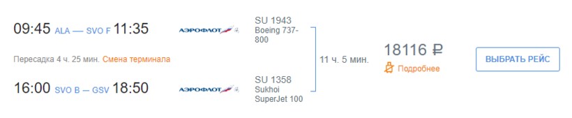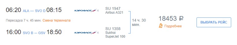 У «Аэрофлота» предусмотрено 2–3 вылета из Алма-Аты, продолжительность перелета варьируется от 11 часов до суток. Самый удобный рейс, вылетающий утром. Стыковка будет в Москве, ее продолжительность составит всего 4 с половиной часа. Единственным неудобством будет смена терминала в аэропорту Шереметьево.