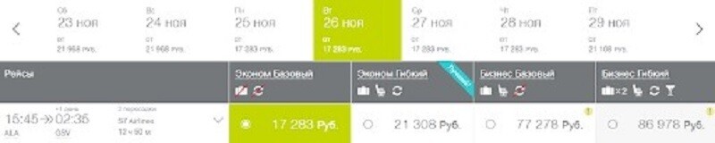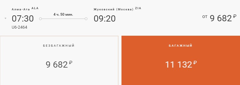 С 1 октября и до конца месяца в расписании есть совместный рейс с Air Astana, он долетает на час быстрее, но стоимость билетов выше. Самый дешевый тариф «Эконом Базовый» отсутствует, стоимость «Эконом Гибкий», куда включен багаж, начинается от 25000 рублей.