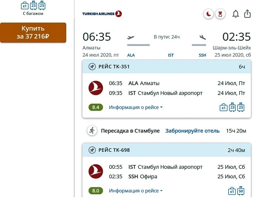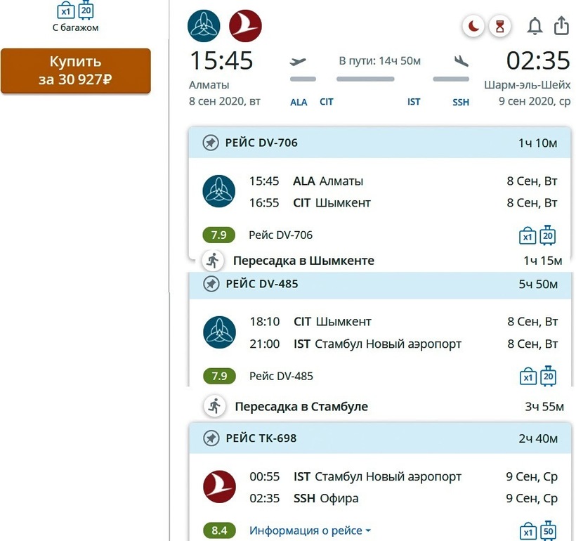 Туристам, которые хотят долететь до египетского курорта максимально быстро, рекомендую рейсы с двумя самостоятельными стыковками. Например, можно преодолеть маршрут за 15 часов (включая пересадки в 1,5 часа в Шымкенте и 4 часа в Стамбуле) с компаниями SCAT и «Турецкие авиалинии». Авиабилет только туда обойдется от 31000 ₽.