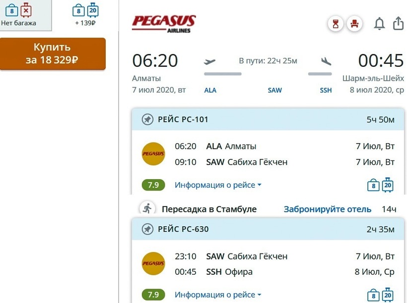 Данный бюджетный оператор осуществляет авиаперелеты только с апреля по ноябрь по вторникам, четвергам и воскресеньям. Вылет также утренний. С пересадкой в Стамбуле в 14–15,5 ч. путешествие займет 22,5–24 часа. Учитывая длительное время дневной стыковки (это же касается и полета с Turkish Airlines), советую осмотреть основные стамбульские достопримечательности. Например, следует посетить дворец Топкапы и водохранилище «Цистерна Базилика», собор Святой Софии и Голубую мечеть. Кроме того, можно взглянуть на город с обзорной площадки Галатской башни, поторговаться на Гранд базаре и проплыть на кораблике по Босфору. У Pegasus не могу отнести билеты к очень дешевым, но их стоимость ниже, чем у главного турецкого авиаперевозчика: на ближайшие даты перелет только туда обойдется с багажом в 18500–21000 ₽, если оформить и в обратную сторону — от 39500 ₽. Цена путешествия с ручной кладью отличается незначительно — ниже всего на 500 ₽ в одну сторону. Бизнес-класса у лоукостера нет.
