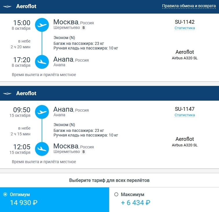 Аэрофлот (SU 1145) Airbus A320 | 02:55 Анапа (AAQ) | 2 ч. 20 мин | 05:15 Москва (SVO) | 30 октября |