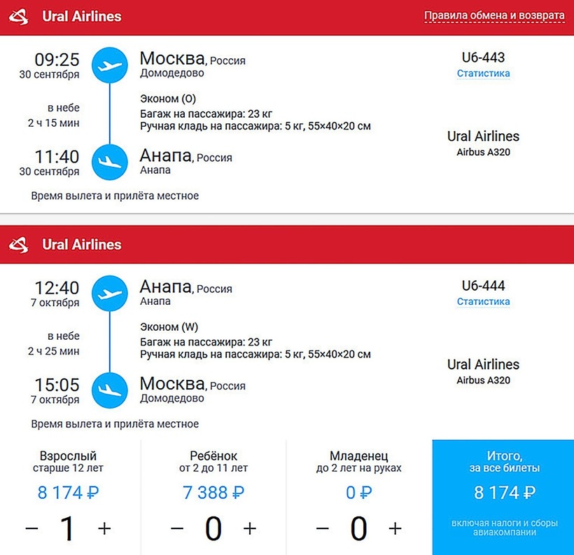 Рекомендую искать билеты «Уральских авиалиний»: по тарифу «Эконом» не только предлагается самая невысокая стоимость, но и включена возможность сдачи или обмена билета.