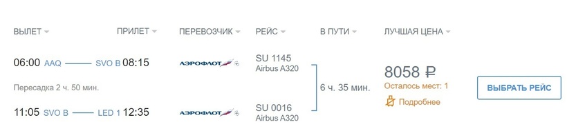 Иногда путешествую с тем же «Аэрофлотом». Общее время в пути — 6,5 часа (напомню, что прямой самолет доставит до места за 3 часа).
