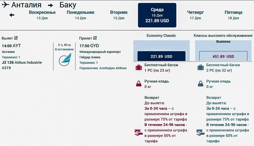 Азербайджан Хава Йоллары (J2 26) Airbus A319 | 11:00 Анталия (AYT) | 2 ч. 50 мин | 14:50 Баку (GYD) | 30 сентября, 6, 8, 18, 20, 25 октября, 5, 12, 19, 26 ноября |