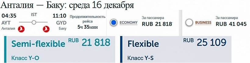 Прямые авиаперелеты по направлению совершает компания «Азербайджанские авиалинии» (AZAL). В осенне-зимний период самолеты оператора летают всего один раз в неделю — по средам. Зато с апреля по середину октября рейсы выполняются ежедневно. Авиапутешествие занимает 3 ч. Билет в одну сторону у AZAL можно купить за 17000 ₽ (222 $), туда-обратно — от 34000 ₽ (448 $). Как видно, при оформлении перелета сразу в обе стороны скидки у авиаоператора нет. Не получится также сэкономить на багаже, так как у данной компании провоз чемодана весом в 23 кг уже включен в минимальный тариф. Любителям бизнес-класса полет обойдется от 34500 ₽ (452 $). Рекомендую у AZAL покупать авиабилеты минимум за 1 неделю до даты вылета, потому что на ближайшие дни цены могут быть выше в 2 раза. Также лучше позаботиться о предварительном оформлении авиаперелета на июнь–сентябрь, так как это самое популярное время путешествий по маршруту, и недорогие билеты пользуются наибольшим спросом.