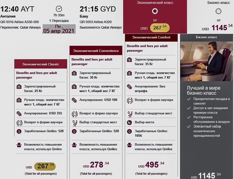Наиболее удобный вариант преодоления пути — лететь напрямую с «Азербайджанскими авиалиниями». Кроме того, этот оператор предлагает и самые дешевые билеты по маршруту. В весенне-летнее время, когда полеты по направлению пользуются наибольшим спросом, в качестве альтернативы прямому перевозчику могу рекомендовать авиапутешествие с компанией Qatar, у которой авиабилеты дороже всего на 3500–5000 ₽, чем у AZAL. Мне необходимо было преодолеть маршрут в ноябре в тот день, когда беспересадочный рейс не выполнялся (напомню, в осенне-зимний период самолеты AZAL летают только по средам). Я выбрала авиапутешествие с Turkish Airlines, так как, во-первых, у этой компании самый гибкий график полетов. Во-вторых, билеты у турецкого оператора были дешевле на 10000 ₽, чем у «Аэрофлота».