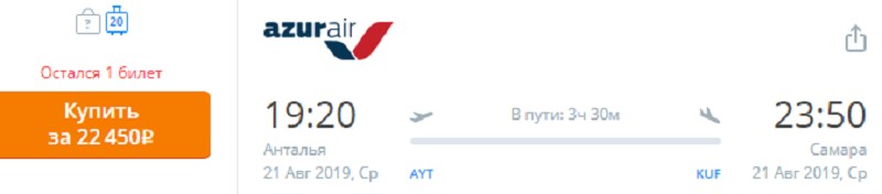 Azur Air. Выполняет чартерные рейсы по маршруту с середины апреля по конец сентября по понедельникам, вторникам, средам, четвергам и субботам. Проанализировав цены у этого турецкого авиаперевозчика, хочу отметить, что у него большая разбежка в стоимости авиабилетов: в одну сторону на ближайшие даты полет обойдется от 9500 рублей, а при бронировании примерно за 10 и больше дней до отправления от 22500 ₽. Авиаперелет туда–обратно от 30000 ₽. Поэтому, как и в случае с предыдущей авиакомпанией, рекомендую ждать акционных цен и покупать билеты перед самым вылетом. В стоимость включен багаж до 20 кг, а вот питание Azur Air на своих авиарейсах не предлагает.