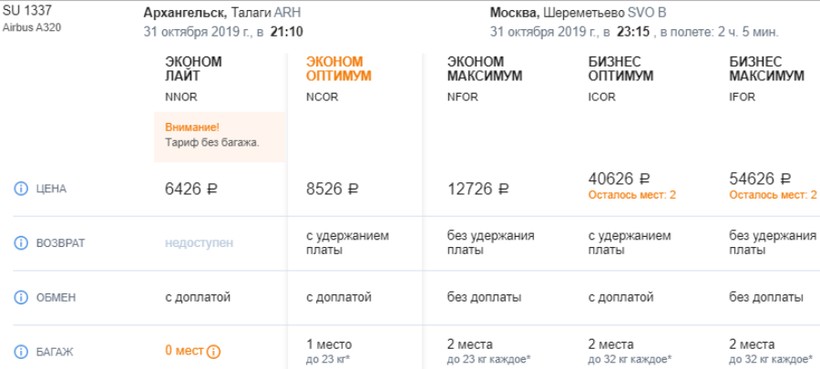 | Россия (FV 6504) Сухой Суперджет 100 | 11:05 Архангельск (ARH) | 1 ч. 55 мин | 13:00 Москва (SVO) | 23, 24, 25 октября |