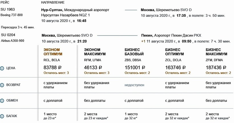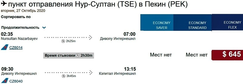 Air China (CA 792) Boeing 737 | 23:40 Нур-Султан (Астана) (NQZ) | 8 ч. 50 мин | 11:30 Пекин (PEK) | пн, ср, пт по 24.10 |