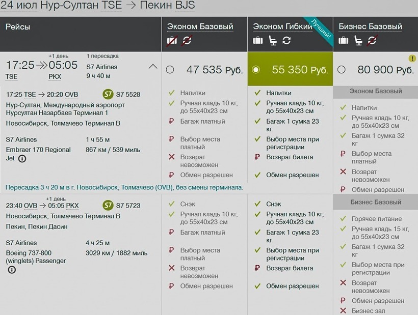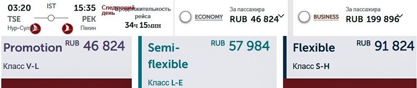 В весенне-летний период выбор перевозчиков по направлению небольшой, поэтому я могу рекомендовать путешествие с «Аэрофлотом», у которого стоимость авиабилетов туда-обратно ниже на 14500 ₽, чем у S7, и на 53000 ₽, чем у Turkish Airlines. Кроме того, у «Аэрофлота» наиболее удобное расписание полетов, и время в пути с российским оператором тратится относительно немного. Я летала в китайскую столицу в ноябре с Air Astana, во-первых, потому что этот авиаперевозчик предлагает максимально быстрый вариант полета. Во-вторых, билеты у компании самые дешевые — если сравнивать с другими описанными операторами, мне удалось сэкономить 33500–86500 ₽ (туда-обратно).