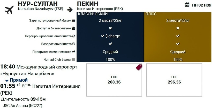 Air Astana (KC 227) Airbus А320 | 18:05 Нур-Султан (Астана) (NQZ) | 5 ч. 10 мин | 02:15 Пекин (PEK) | 4 октября |