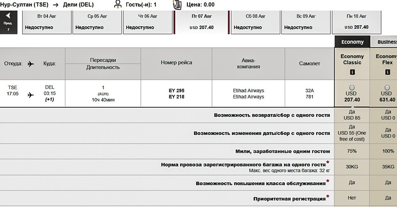 Путешественникам, которые летят по направлению только в одну сторону и ищут максимально бюджетный вариант преодоления пути, советую отдать предпочтение полету с компанией Etihad, у которой билеты дешевле на 12000 ₽, чем у «Аэрофлота», на 11500 ₽, чем у Air Astana, и на 11000 ₽, чем у flydubai. Я покупала авиабилеты сразу туда-обратно у Air Astana, потому что в обе стороны с багажом этот оператор предлагает самый дешевый вариант перелета. Мне удалось сэкономить около 9000–11000 ₽, по сравнению с flydubai и «Аэрофлотом». Хотя цена путешествия с казахским перевозчиком сопоставима с Etihad, с первой компанией путь занимает на 3–5 часов меньше времени.