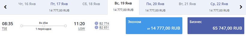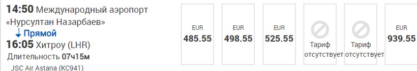Air Astana (KC 941) Airbus A320 | 11:20 Нур-Султан (Астана) (NQZ) | 10 ч. 30 мин | 16:50 Лондон (LHR) | 30 апреля, 5, 7 мая |