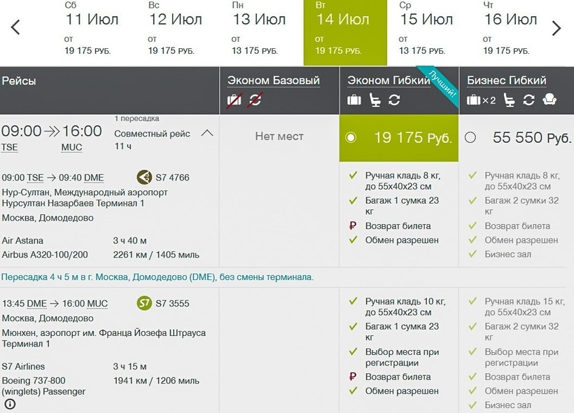 Air Astana и S7 Airlines осуществляют совместные авиаперелеты с ноября по апрель по понедельникам, вторникам, четвергам и субботам, в остальные месяцы — во все дни недели, за исключением пятницы и воскресенья. Со стыковкой в Домодедово в 4–4,5 часа полет займет 11–11,5 ч. Я могу отнести путешествие с этими операторами к одному из лучших вариантов преодоления пути, потому что билеты у авиакомпаний дешевые: с багажом только туда стоят от 19000 ₽, в обе стороны — от 37000 ₽. Тариф только с ручной кладью Air Astana и S7 не предлагают. Бизнес-класс — всего от 55500 ₽.