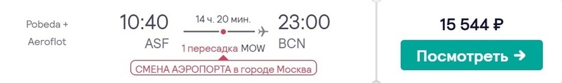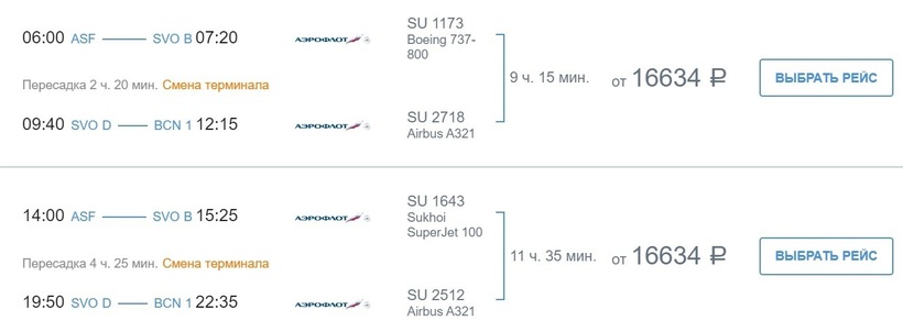 Круглогодичные ежедневные авиарейсы (расписание стабильное) со стыковкой в столице РФ предлагает авиаоператор «Аэрофлот». Есть 8–9 вариантов перелетов, все разной продолжительности. Минимальное время в пути — 9 часов, максимальное — сутки с небольшим. В это время входит и стыковка в Шереметьево (от 2,5 до 18,5 ч.). Авиагавань является хабом «Аэрофлота» в Москве. Кстати, авиаузел неоднократно получал статус лучшего аэропорта Европы по качеству обслуживания. Внутри хорошо продуманная инфраструктура, понятная навигация. Также удобно, что полетите по единому авиабилету. В аэропорту Астрахани получите два посадочных талона, и ваш багаж будет зарегистрирован до конечного пункта, то есть до Барселоны. В Шереметьево не нужно будет получать багаж, проходить заново регистрацию на рейс. Проходите сразу на предполетный досмотр. За пару недель и более до вылета стоимость авиабилетов только туда составляет минимум 16600 рублей.