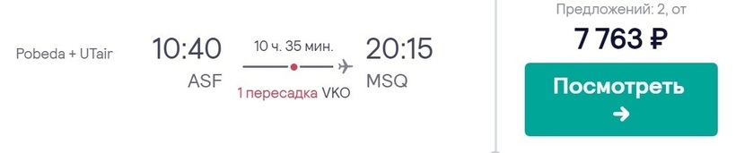 Скажу сразу, что добраться без пересадок до места назначения не удастся. Между Астраханью и Минском нет прямого авиасообщения. Но выход есть — путешествуйте транзитом. Днем из аэропорта Астрахани можно улететь с российским лоукостером «Победа» и белорусской а/к «Белавиа». Перевозчики доставят до конечного пункта за 8 часов. На пересадку в аэропорту Санкт-Петербурга (Пулково) уйдет 3,5 часа. За это время вам нужно будет забрать багаж и зарегистрироваться на следующий рейс до Минска. Теперь про цены на билеты. За месяц до вылета лайнера билет можно купить за 10100 рублей. Это минимальная цена. У «Победы» есть только эконом, а у «Белавиа» имеется еще и бизнес-класс.