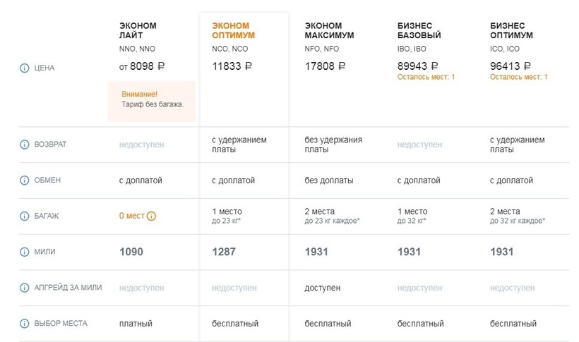«Оптимум». Разница в стоимости с «Лайтом» — примерно 40%. Включен бесплатный багаж (1 место весом до 23 кг) и выбор места в салоне самолета.