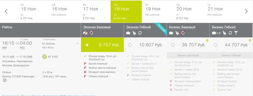 Также стыковочным рейсом в Пермь можно попасть и с S7. Общее время в пути — 9–11 часов (в зависимости от дня недели). Примерно половину этого времени займет пересадка в Домодедово. Авиабилеты незначительно дешевле, чем у «Аэрофлота» — от 8800 р. за месяц до отправления (обратный будет стоить столько же). В экономкласс и бизнес-класс по 2 тарифа, которые различаются набором опций.