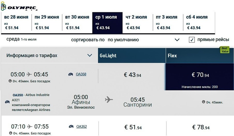 Olympic Air (совместно с Aegean Airlines) с апреля по конец октября совершает ежедневно по семь-восемь беспересадочных полетов, в осенне-зимний период самолеты летают трижды в день. Билеты у оператора недорогие: только туда с ручной кладью обойдутся от 3500 ₽ (44 €), в обе стороны — от 6000 ₽ (76 €). Цена путешествия с багажом до 23 кг будет выше на 2000 ₽ (26 €).
