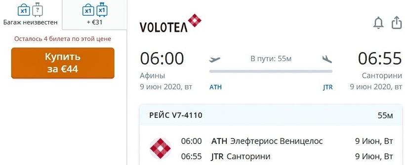 Volotea с апреля по ноябрь выполняет по три-пять ежедневных авиарейсов, в остальные месяцы самолеты летают всего по одному разу в день. Стоимость билетов у этого испанского лоукостера сопоставима с ценами вышеописанного оператора: полет только туда в среднем обойдется в 3200–4200 ₽ (40–52 €), в обе стороны — от 5800 ₽ (72 €). Но Volotea проигрывает греческой авиакомпании по стоимости багажа — за провоз чемодана до 20 кг придется заплатить 2300–2500 ₽ (29–31 €).