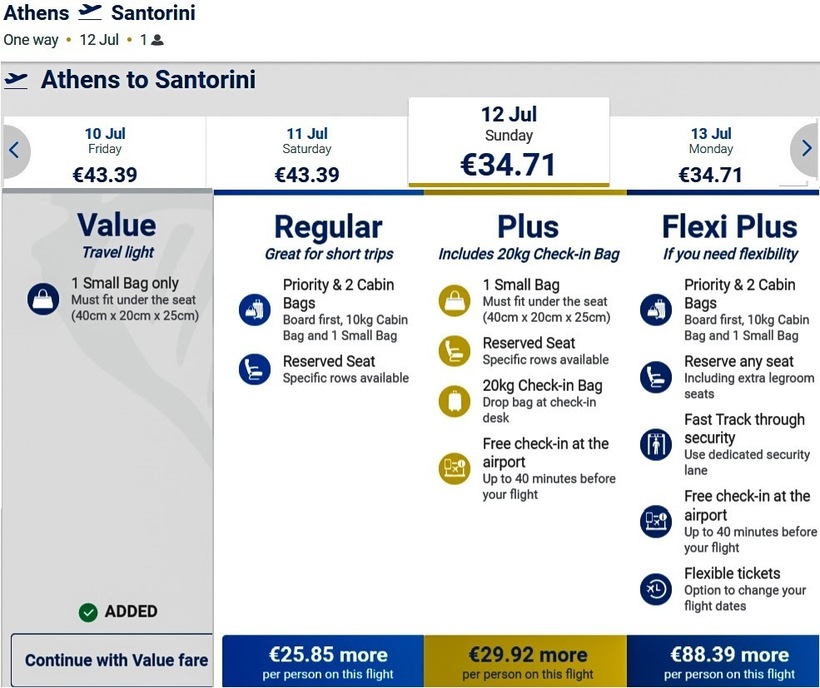 Преодолеть путь напрямую получится примерно за 1 час. И учитывая достаточно большое число беспересадочных рейсов, выполняемых по направлению, и невысокую стоимость авиабилетов, лететь транзитом нецелесообразно. Для перелета в обе стороны в летнее время только с ручной кладью могу рекомендовать компанию Ryanair, цена путешествия с которой туда-обратно будет ниже на 1000 ₽, чем с Olympic Air, на 800 ₽, чем с Volotea, и на 1900 ₽, чем со Sky Express. Кстати, у британского лоукостера часто и полет в одну сторону дешевле, чем у остальных прямых перевозчиков (экономия составляет 400–1000 ₽). Я летала по маршруту в ноябре и для своего путешествия с багажом выбрала авиакомпанию Olympic Air, у которой на перелете туда-обратно в осенне-зимнее время можно сэкономить около 9000 ₽, по сравнению со Sky Express. И хотя стоимость билетов у Volotea и Olympic Air сопоставима, зато расписание полетов у второго перевозчика удобнее. Кстати, ни один из описанных выше операторов не предлагает по данному направлению полет в бизнес-классе.