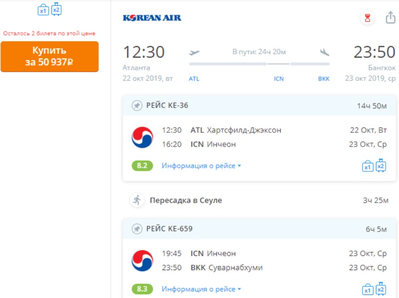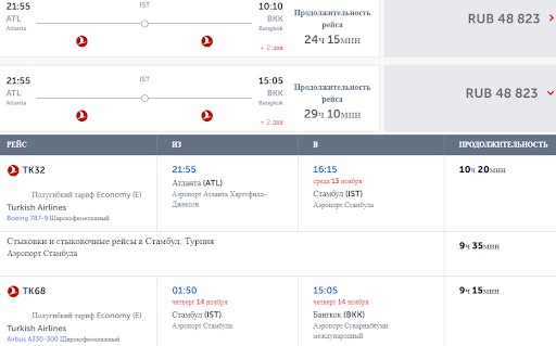 Кроме описанных мной выше авиарейсов с одной пересадкой, чтобы сэкономить, можно лететь из Атланты в Бангкок с двумя стыковками — цена путешествия будет ниже примерно на 7000–10000 ₽. Неплохим вариантом, который мне удалось найти, является рейс Delta Air Lines и China Airlines через Сан-Франциско и Тайвань. Самый длительный отрезок полета займет 14 часов, а вместе с двумя пересадками по часу время в пути составит чуть меньше суток. Авиабилет в одну сторону (с багажом) обойдется в 35000 ₽. Полеты с более длительными стыковками и большим количеством пересадок я считаю нецелесообразными. Так на еду и гостиницы можно потратить больше, чем в итоге сэкономить.