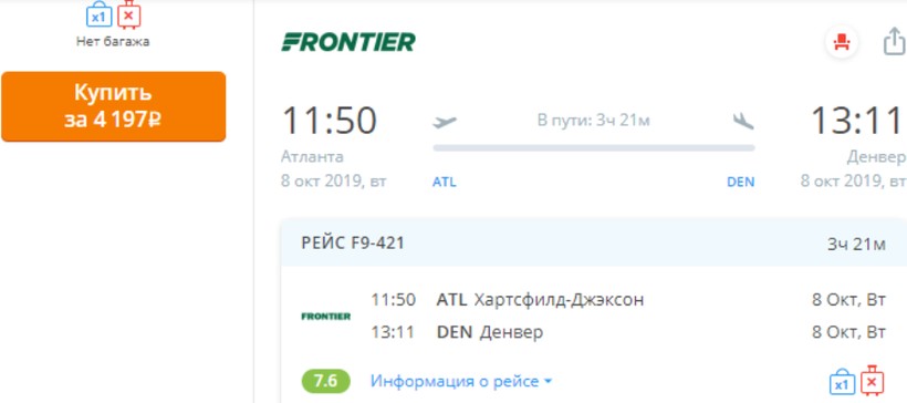 | Frontier Airlines (F9 3293) Airbus А320 | 07:34 Атланта (ATL) | 3 ч. 24 мин | 08:58 Денвер (DEN) | 2 октября |