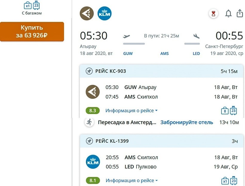Авиасообщение между казахстанским Атырау и российским Петербургом не очень развито — прямые перелеты по данному направлению не осуществляются, а удобные транзитные авиарейсы с одной стыковкой предлагает всего два оператора: