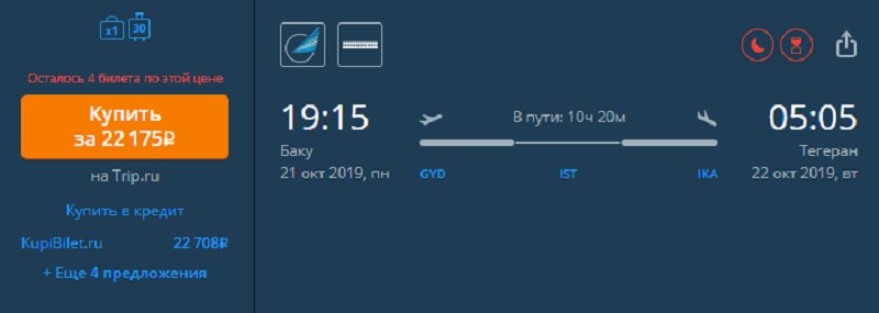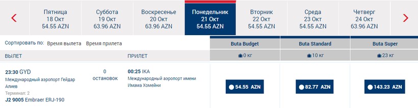 Buta Airways — азербайджанская бюджетная авиакомпания. Совершает один регулярный прямой перелет между Баку и Тегераном. Стоимость по тарифу «Бюджет» — от 2000 рублей в одну сторону (минимум за три-четыре недели до вылета). Цена в течение года особо не меняется. Но на борту отсутствует питание. Если у вас имеется багаж, то приобретайте билет «Стандарт», по нему уже можно взять чемодан весом до 10 кг. Есть еще ряд преимуществ: возможен возврат авиабилета, разрешается выбрать место самостоятельно, дают бутерброды.