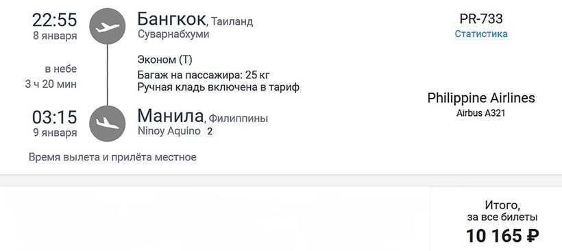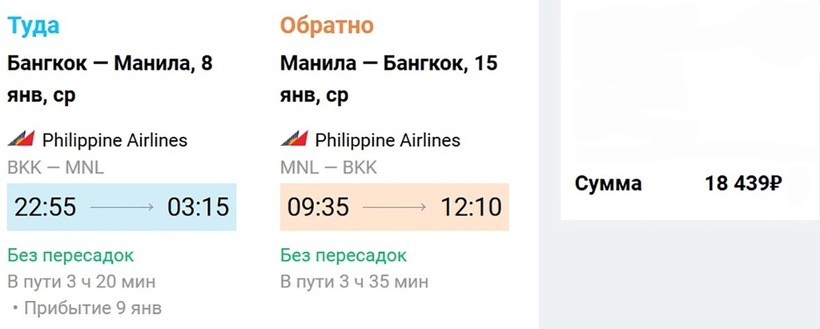 | Thai (TG 624) Airbus A350-900 | 14:15 Бангкок (BKK) | 3 ч. 10 мин | 18:25 Манила (MNL) | ежедневно с 01.01 по 15.01 |