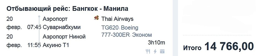 | Thai (TG 620) Airbus A350-900 | 07:45 Бангкок (BKK) | 3 ч. 10 мин | 11:55 Манила (MNL) | 25 декабря |