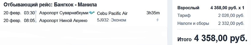 | Cebu Pacific (5J 932) Airbus A330-900 | 03:25 Бангкок (BKK) | 3 ч. 45 мин | 08:10 Манила (MNL) | 23, 24, 25, 26 октября, 30, 31 марта, 1, 2, 3, 4, 5, 6, 7, 8, 9, 10, 11, 12, 13, 14 апреля, … |