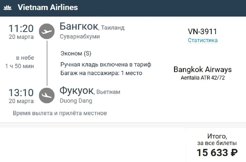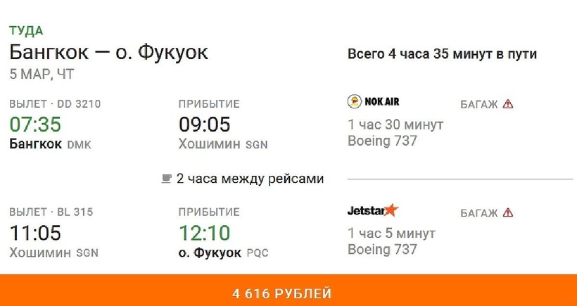 Авиапутешествие в «высокий» сезон (особенно в декабре — ноябре) обойдется дороже. Даже при бронировании за 10–11 месяцев цена перелета начинается с 11000 ₽. Этот вариант может быть альтернативой полету Bangkok Airways — его главное преимущество в более удобном расписании. У других авиакомпаний есть более дешевые варианты транзитного авиапутешествия. Но это рейсы с самостоятельной пересадкой. При подобной стыковке нужно пройти регистрацию на второй рейс, получить багаж, а потом опять сдать его. И что хуже всего (на мой взгляд) в случае опоздания на второй самолет ваш авиабилет просто аннулируют. Вам не вернут деньги (хотя бы частично) и не предложат лететь другим лайнером. В общем, это довольно рискованный вариант. Но если вы готовы к трудностям, то вот пара неплохих вариантов. VietJet Air — вьетнамский авиаперевозчик-лоукостер. Его лайнеры летают от Бангкока до Хошимина 3–4 раза в день. Стоимость начинается с 3000 ₽. И от Хошимина до Фукуока тот же лоукостер совершает 2–3 ежедневных полета. Минимальная цена — 1200 ₽. С собой можно брать не более 7 кг вещей. Или можно лететь до Хошимина на Nok Air за 2400 ₽, а потом пересесть на лайнер Jetstar Pacific Airlines (еще один бюджетник Вьетнама). Чьи самолеты 5–6 раз за день летают между островом Фукуок и Хошимином. Цена от 1200 ₽. Но это тоже полет «налегке» с ручной кладью на 7 кг.