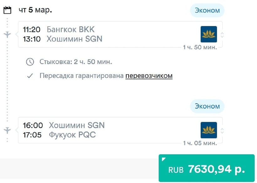 Кроме прямого перелета у авиакомпании Vietnam Airlines есть рейсы со стыковкой в Хошимине (аэропорт Таншоннят). В день совершается 5–7 перелетов. Стыковки от 2,5 часов. Если лететь в низкий сезон (май — сентябрь), то за 2 недели до вылета можно купить билет за 7,5 тысяч ₽ с багажом (20 кг) и ручной кладью (5 кг).