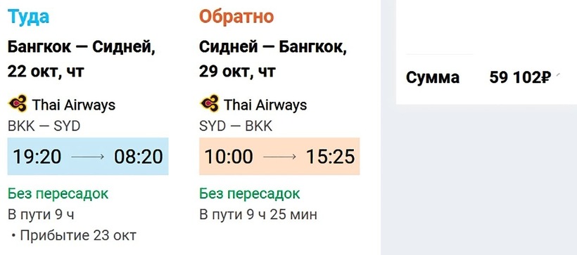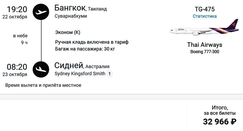 | Thai (TG 475) Airbus A350-900 | 08:30 Бангкок (BKK) | 9 ч. 00 мин | 21:30 Сидней (SYD) | ежедневно по 25.10 |
