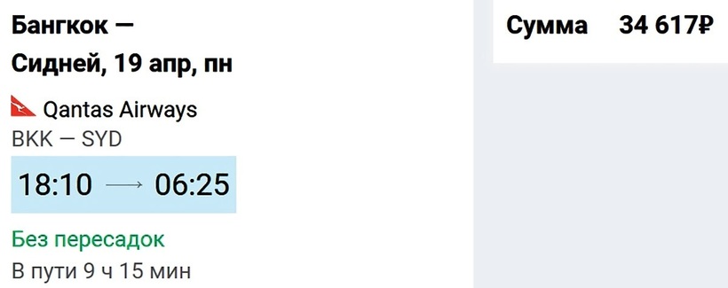 | Qantas Airways (QF 24) Airbus А330-200 | 18:10 Бангкок (BKK) | 9 ч. 15 мин | 07:25 Сидней (SYD) | 29 марта |