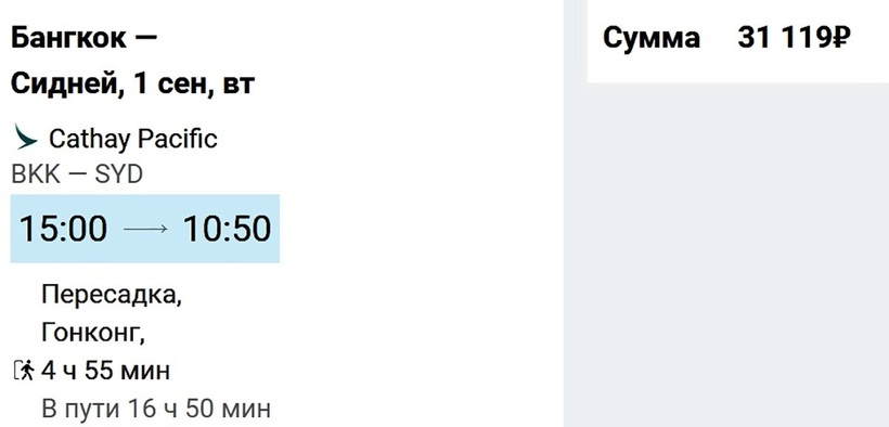 По данному маршруту многие авиакомпании выполняют стыковочные рейсы, но наиболее удобный перелет у Cathay Pacific, национальной авиакомпании Гонконга. Ее самолеты летят через Гонконг. Расписание вмещает до 25 рейсов ежедневно, особенно много их в туристический сезон — с ноября по февраль. «Окно» между рейсами варьируется от 1 до 20 часов, рекомендую выбирать стыковку продолжительностью более 2 часов — хаб Гонконга уж очень большой. При бронировании за 1–1,5 месяца можно улететь за 13000 батов (31000 ₽) с багажом до 30 кг.