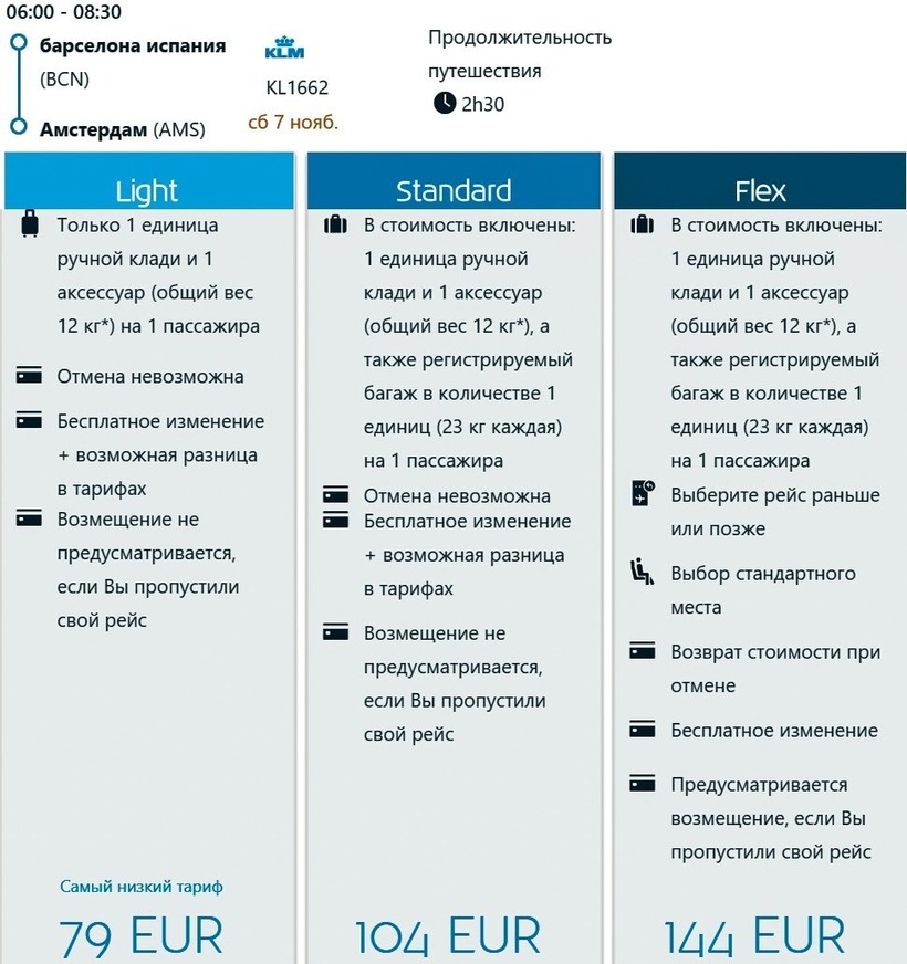| KLM (KL 1512) Boeing 737-800 | 11:10 Барселона (BCN) | 2 ч. 20 мин | 13:30 Амстердам (AMS) | 26, 27, 28, 29, 30, 31 октября, 1, 2, 3, 4, 5, 6, 7, 8, 9, 10, 11, 12, 13, 14 ноября, … |