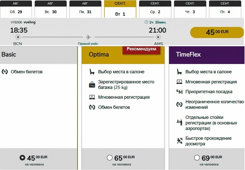 | Vueling airlines (VY 8316) Airbus A320 | 08:30 Барселона (BCN) | 2 ч. 30 мин | 11:00 Амстердам (AMS) | 30 сентября, 21 октября |