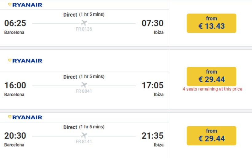 Ирландская бюджетная авиакомпания выполняет регулярные рейсы из Барселоны на Ибицу, в расписании до середины ноября 2019 года есть 3 вылета — утренний, дневной и вечерний. После этого времени самолеты по вечерам не будут летать по вторникам и средам.