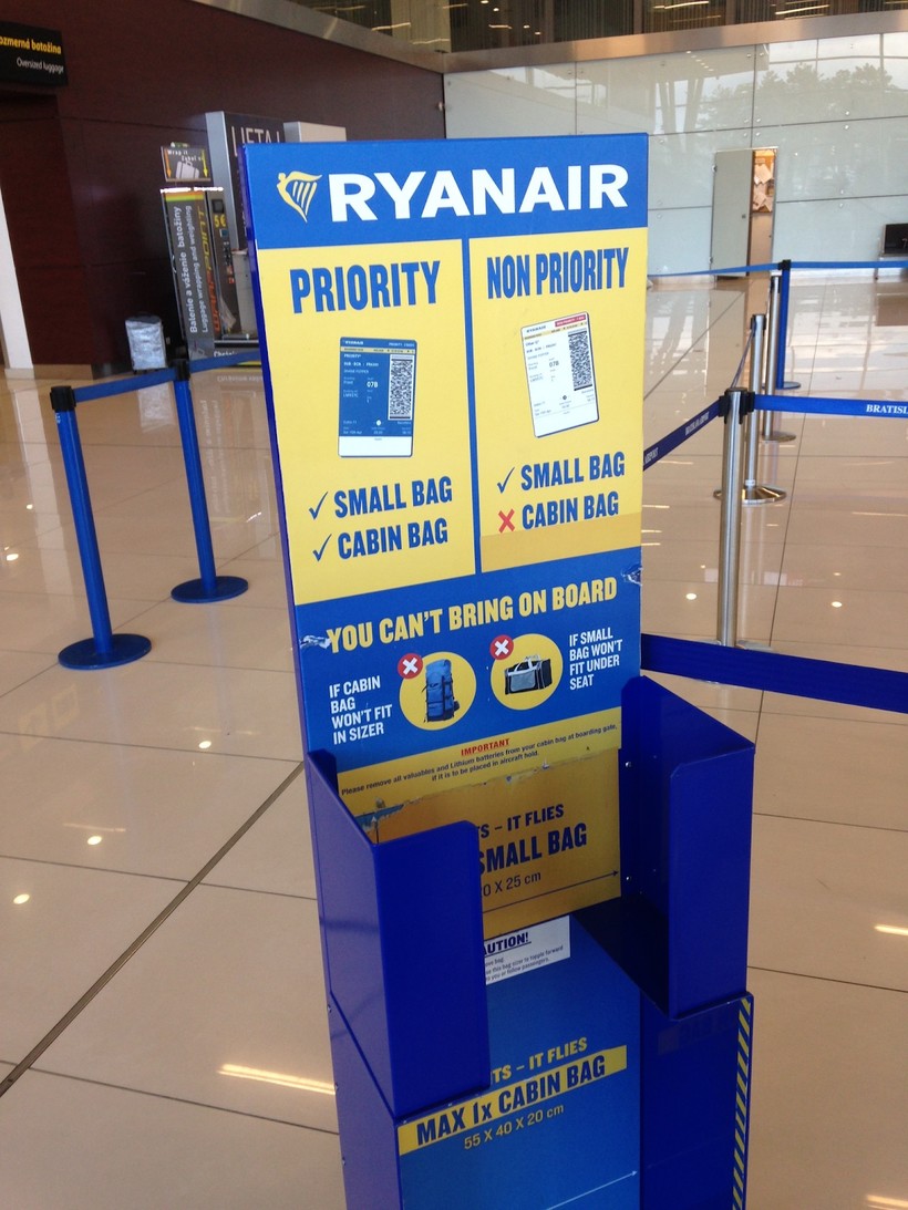 Когда я путешествую с данной авиакомпанией, то всегда выбираю Standard fare и просто доплачиваю за багаж на сайте 14 евро (1000 рублей), так будет гораздо выгоднее, нежели покупать тариф Plus. В аэропорту оплатить провоз чемоданов будет дороже, с вас возьмут 50 евро (3500 рублей). Отмечу минусы Ryanair — салон самолета тесный, между рядами и сиденьями маленькое пространство, жесткие требования к ручной клади, если она не поместится в калибраторе, вам придется платить за нее дополнительно.