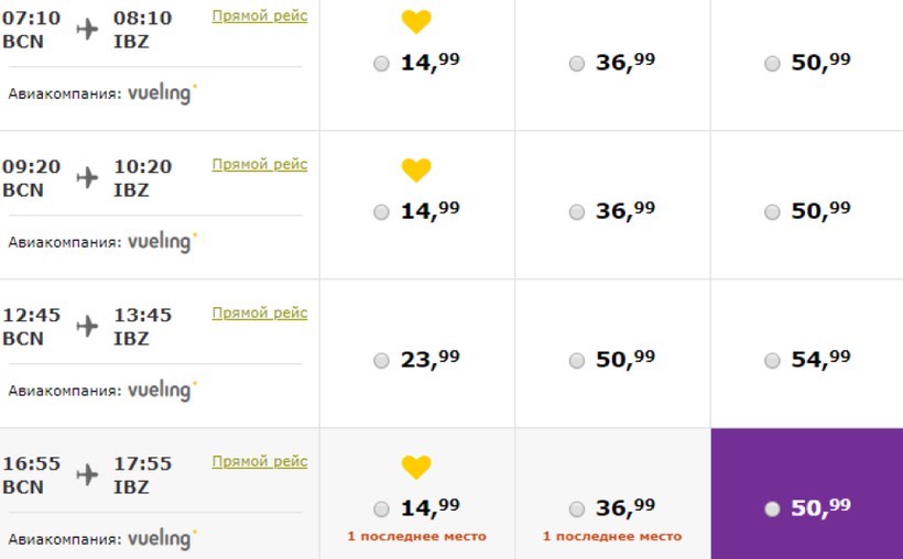 Vueling airlines (VY 3500) Airbus А320 | 14:30 Барселона (BCN) | 55 мин | 15:25 Ибица (IBZ) | 26, 27, 28, 29, 30, 31 октября, 1, 2, 3, 4, 5, 6, 7, 8, 9, 10, 11, 12, 13, 14 ноября, … |