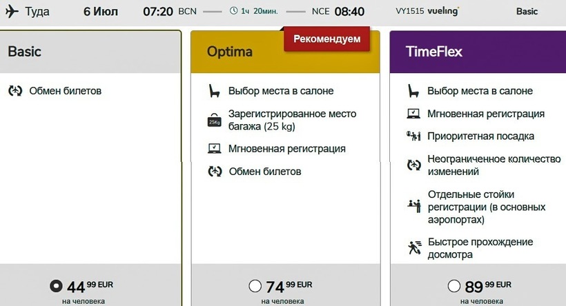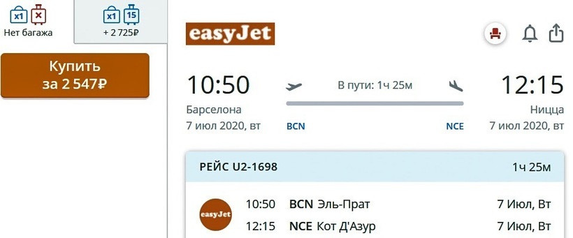 | Vueling airlines (VY 1515) Airbus A320  | 07:10 Барселона (BCN)  | 1 ч. 20 мин | 08:30 Ницца (NCE)  | чт с 25.06 |