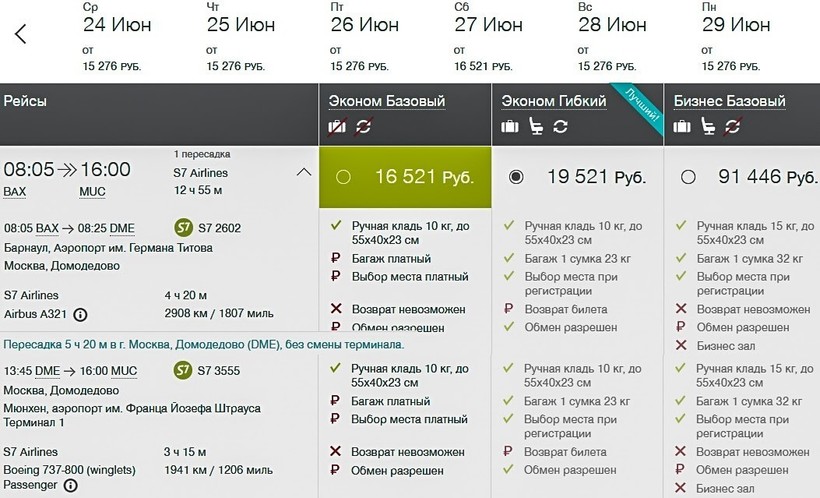 Я летела по направлению с «Аэрофлотом», потому что авиапутешествие с этим оператором занимает на 1,5–3,5 часа меньше времени, чем с S7. Стоимость перелета в экономклассе у компаний сопоставима (как с ручной кладью, так и с багажом). Но если вы покупаете авиабилет с ручной кладью за значительный срок до вылета, советую отдать предпочтение S7, потому что у данного перевозчика минимальный тариф изменяемый. Любителям путешествовать в бизнес-классе советую выбрать полет с S7, потому что у этой авиакомпании цена билетов в данный класс ниже аэрофлотовской на 30500 ₽.
