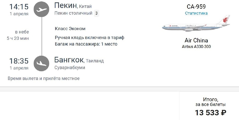 Air China. Государственная авиакомпания Китая выполняет прямые полеты до столицы Таиланда круглый год. В день есть 1–4 рейса. Посадку авиалайнеры совершают в Суварнабхуми. Тарифы экономического класса следующие.