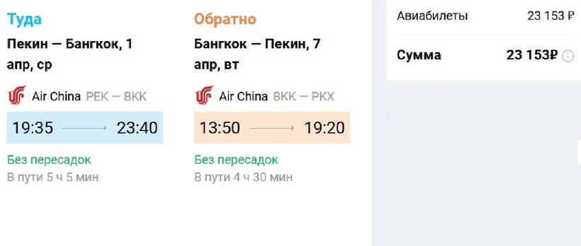 Билеты «туда-обратно» в ноябре обойдутся вам всего в 10 968 рублей, а в апреле придется заплатить за них не менее 19 764 рубля. В среднем же, долететь до Бангкока и вернуться в Пекин можно за 15 200 рублей.