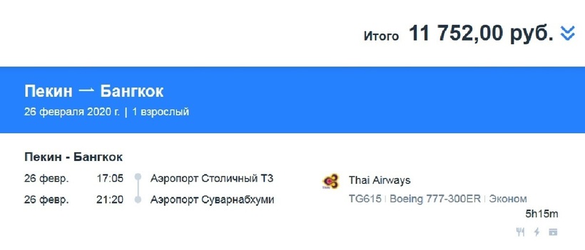| Thai (TG 615) Airbus A350-900 | 17:05 Пекин (PEK) | 5 ч. 15 мин | 21:20 Бангкок (BKK) | ежедневно с 26.10 по 25.03 |