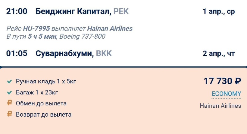 | Hainan Airlines (HU 7995) Boeing 737-800 | 19:00 Пекин (PEK) | 5 ч. 25 мин | 23:25 Бангкок (BKK) | ежедневно с 26.10 по 25.03 |